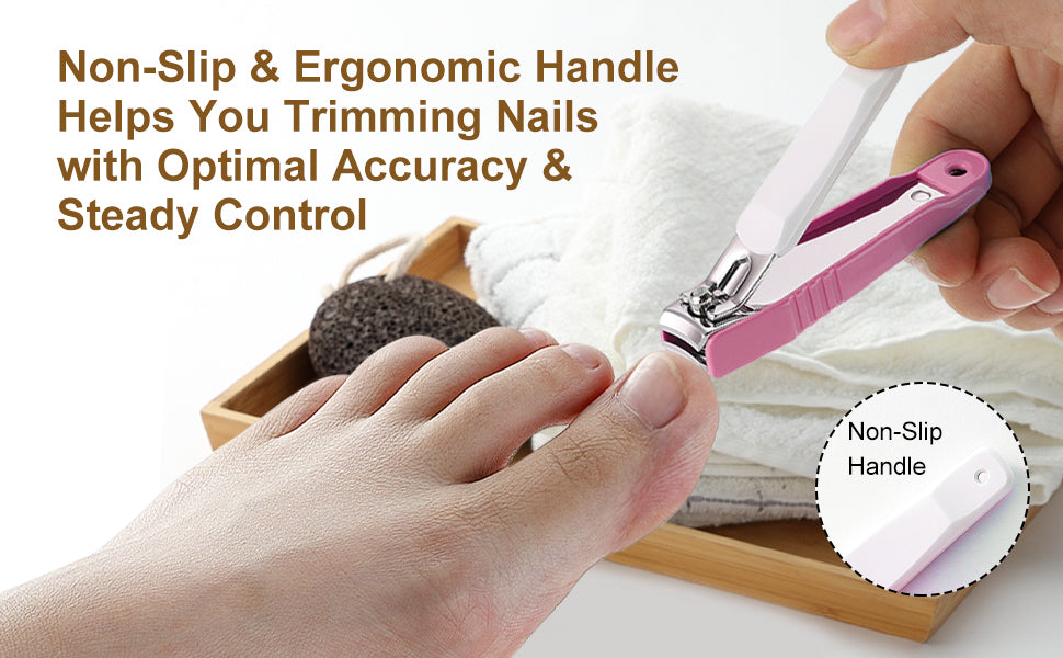 - Ergonomic Design & Non-slip: come with enhanced long handle design making manicure easier, anti-slip design on the lever is great for sweaty hand. No more need to worry slipping out and hurting nails. Both of our nail clippers have a small, but very useful buill-in metal nail file. They are great for smoothing rough edges after clipping and very convenient to use.