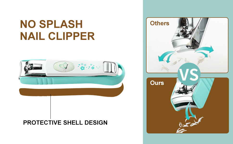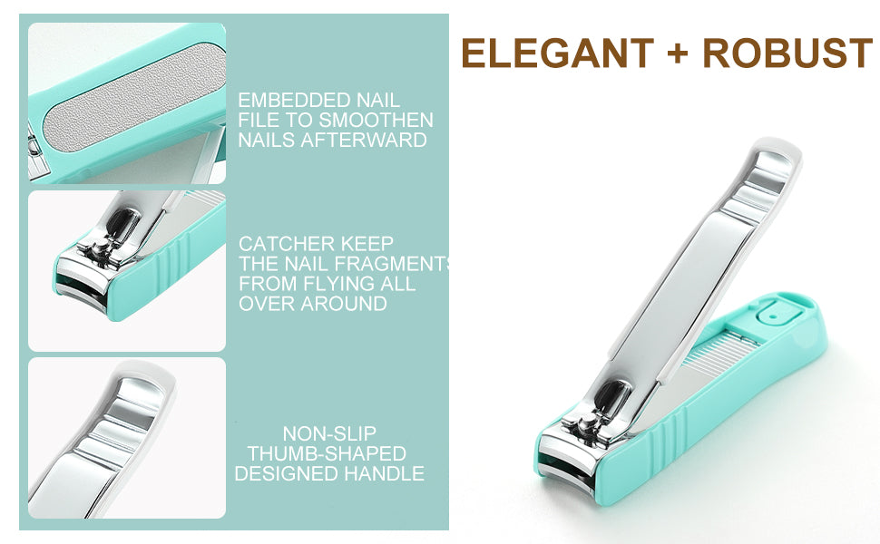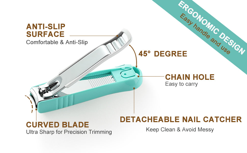 - This nail clipper set use comfortable ergonomic shape to the lever, meet the natural curve of nails. It makes each clip smooth and easier, no need dig your hands into the edges, built for a variety nail types. This nail clipper comes with a nail catcher which makes your nails clippings nearly mess free, no more nail fragmentse scatter around; no need to swipe the floor or vacuum.No risk of splashing eyes by nail fragments anymore!